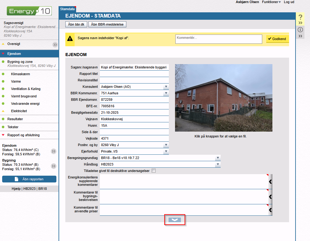 Tilgå derefter din nye kladdesag - og under menupunktet ”Ejendom, bygning og zone” klikker du på "pil-ned", under kommentarfelterne - se markeringen i den røde cirkel herunder: