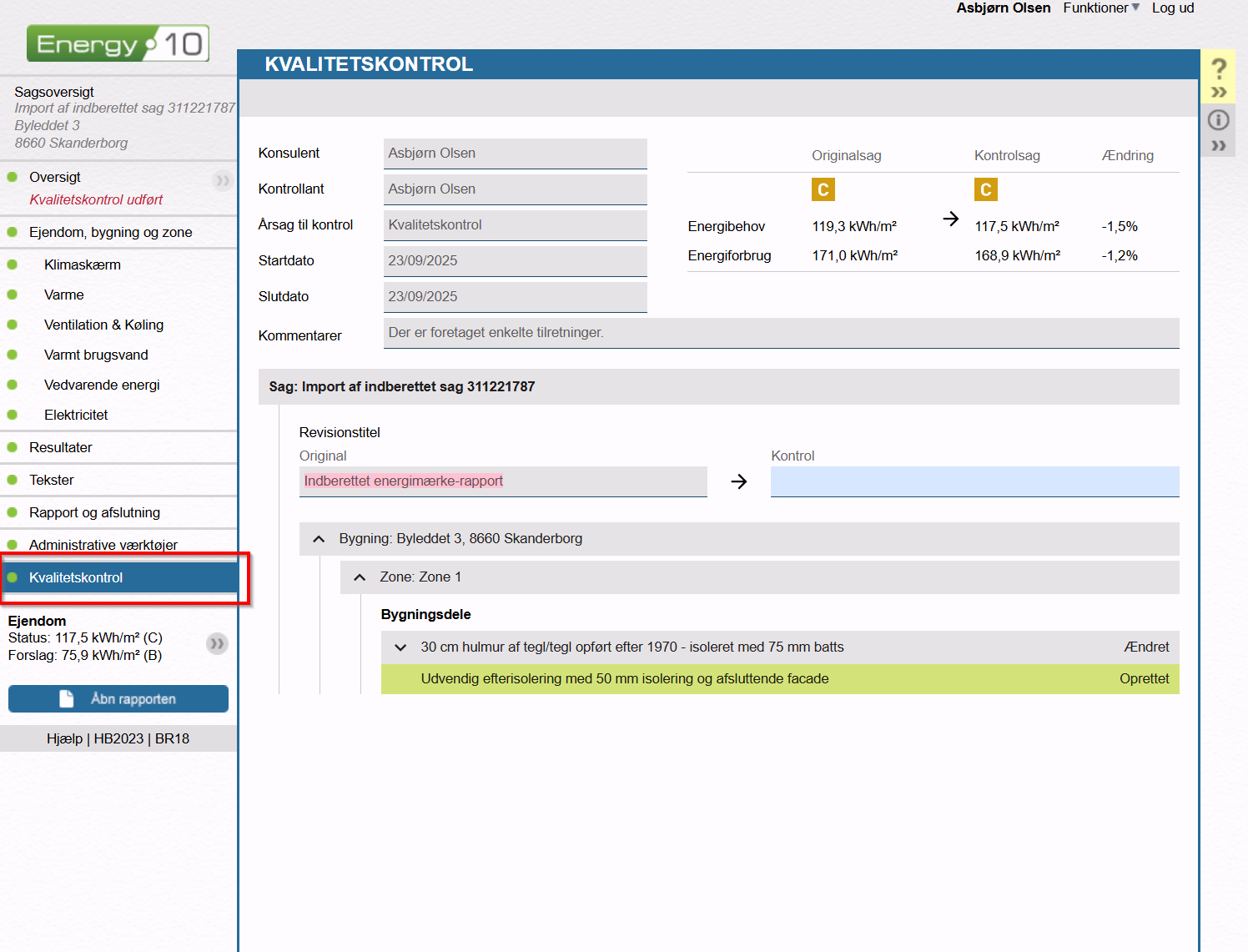 Forskellen mellem den oprindelige sag og den kvalitetskontrollerede sag lagres i Energy10. Alle sagens løbende ændringer og informaioner kan trækkes ud som en samlet rapport efter behov og generel dokumentation.