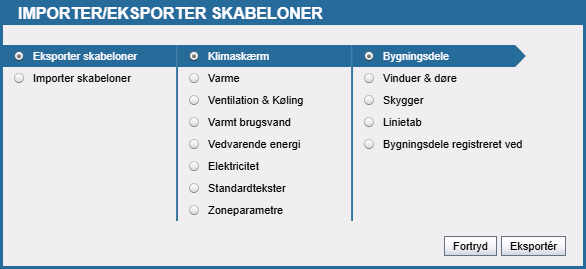 Herved får du et popup-vindue frem, der giver dig mulighed for at eksportere og importere Energy10's prædefinerede excel-regneark, med felthenvisninger, der entydigt passer med programmets opsætning.