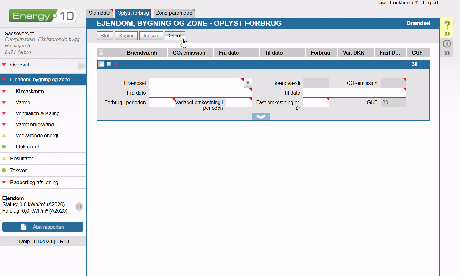Har du modtaget et oplyst forbrug fra bygningsejeren, indtastes det under menupunktet Ejendom, bygning og zone fanen Oplyst forbrug.