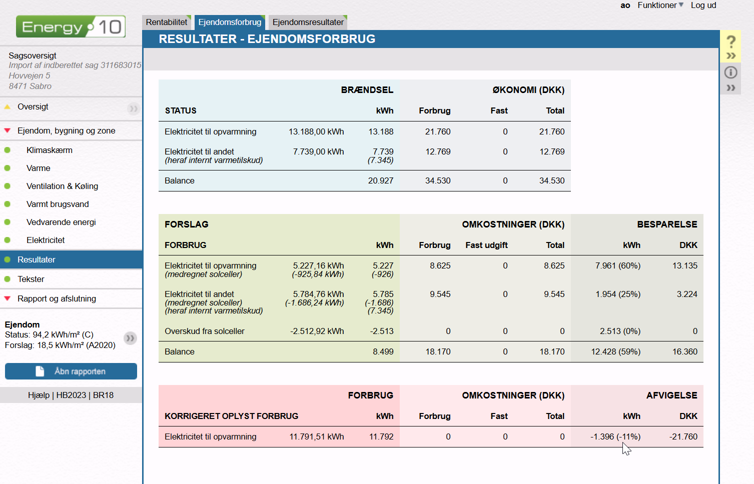Programmet beregner automatisk det klimakorrigerede forbrug, ud fra de almindelige beregningsbetingelser i den gældende håndbog for energikonsulenter, og viser resultatet af de indtastede oplysninger som god kontrolfunktion under menupunktet Resultater og fanen Ejendomsforbrug.