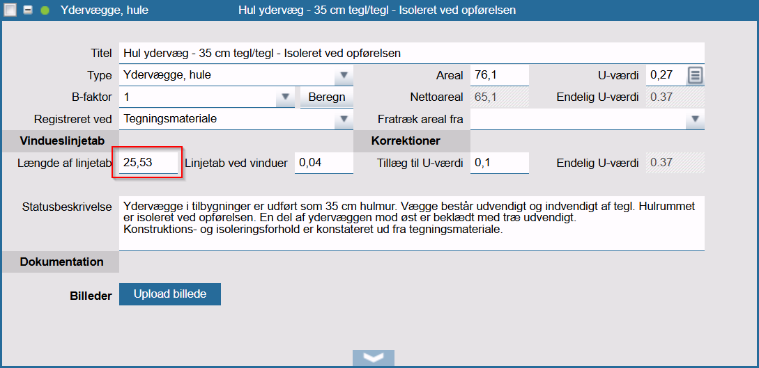 Der er indtastet et samlet linjetab for samlingen mellem vægge og vinduer/døre på 47,5 m. Det forventede linjetab bør ligge indenfor 58 og 71 m. (Hvis der også er fals under vinduer, skal der tillægges ca. 18 m)