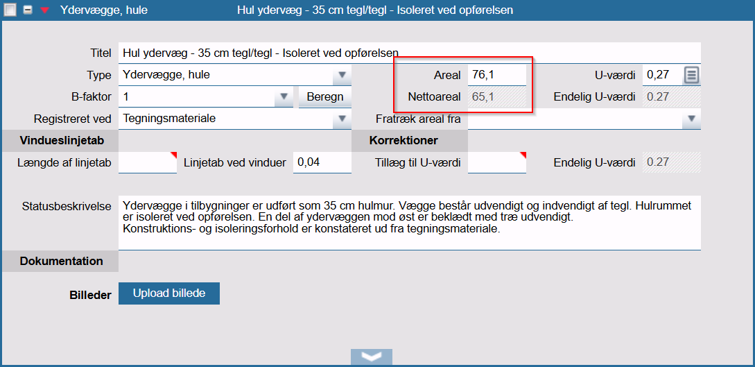 Derefter indtaster du din længde af linjetab, som opmålt efter DS418. Når længden er indtastet sker der en beregning (forholdet mellem murhuls-perimeter og netto ydervægsarealet) iht. HB2023 kapitel 4.7.3.5 Tabel 2 hvorefter feltet Tillæg til U-værdi automatisk bliver udfyldt med den rette værdi.