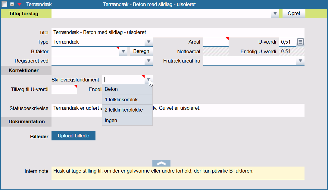 Bemærk at værdierne i håndbogen kun er for enfamiliehuse, hvorfor rullemenuen kun vises her. For flerfamilie- og erhvervsbygninger skal tillægget regnes jf. DS 418.