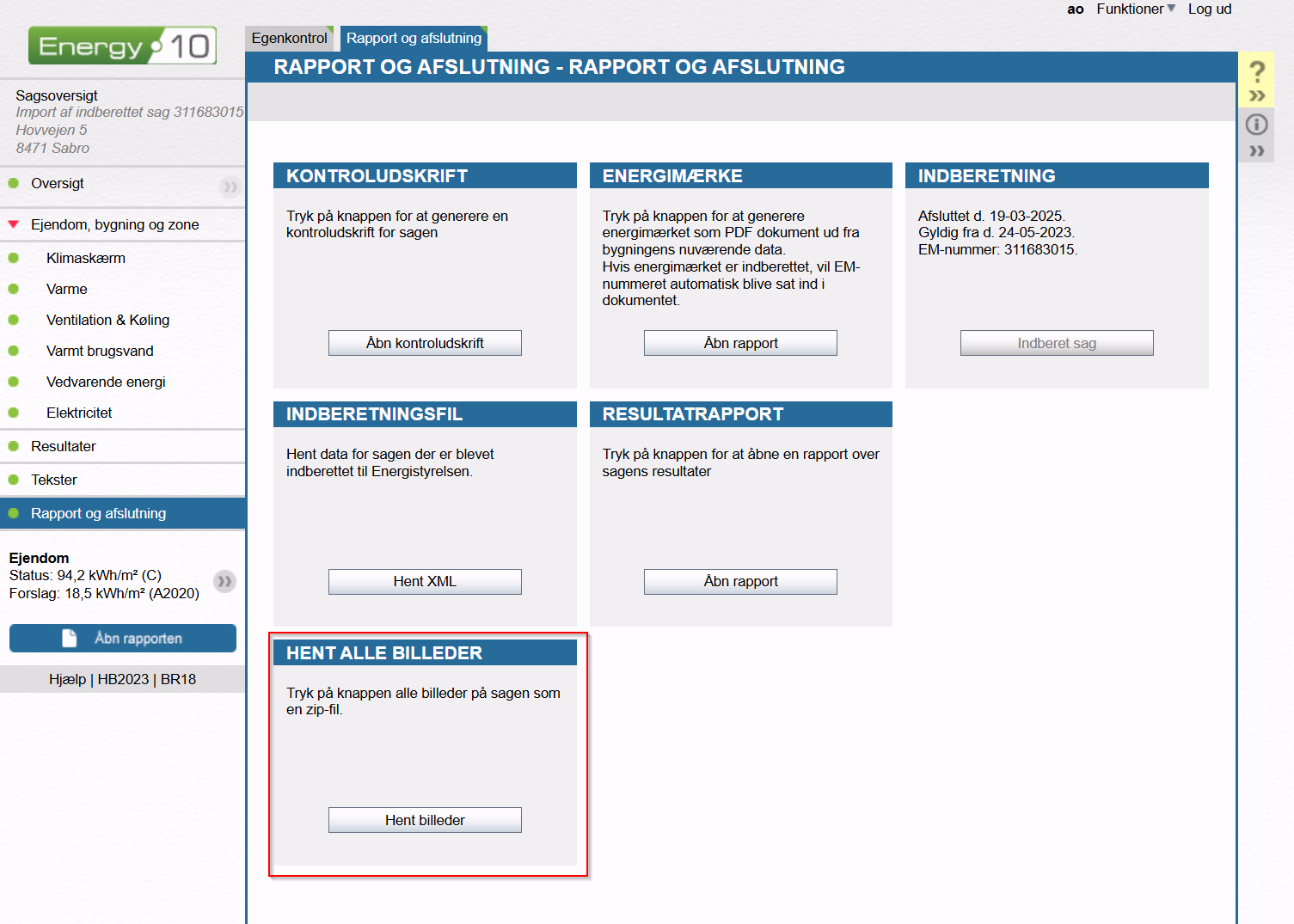 Det er også muligt at hente billederne ud, så du kan ligge dem ind i din sagsmappe. Dette gøres ved at gå til Rapport og afslutning og trykke på knappen angivet nedenfor.