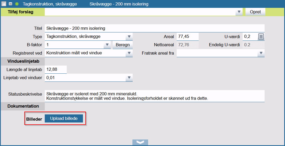 Når du foretager bygningsregistreringer, så har du mulighed for at lægge billeder direkte ind i Energy10 på den bygningsdel du arbejder med. Billederne er ikke en del af indberetningen til Energistyrelsen og er ej heller en del af det det ordinære energimærke.