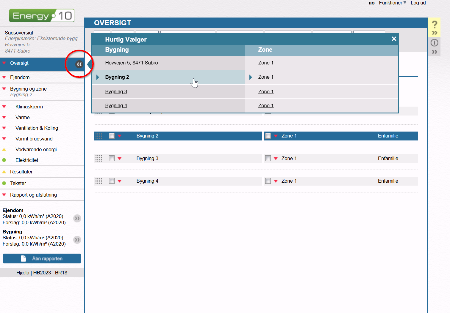 Hvis du klikker på ikonet vises en oversigt over samtlige bygninger/enheder, der er oprettet på sagen. Klik på den ønskede bygning/zone, for at skifte direkte til denne.