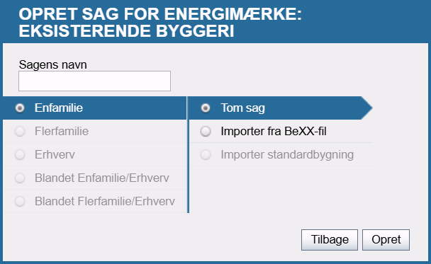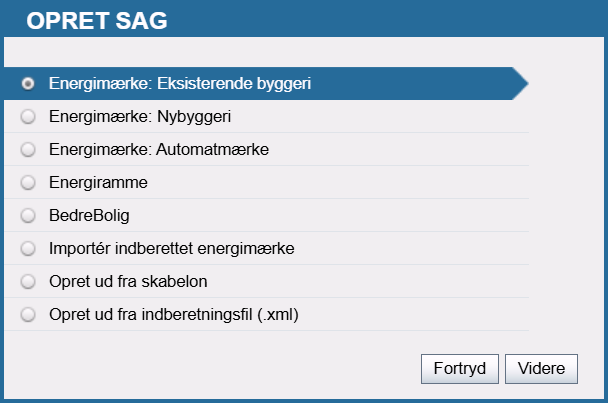 Knappen Opret sag er der, hvor du altid tager udgangspunkt, for at påbegynde en ny sag. Det gælder uanset om du vil oprette et energimærke, en energiramme, eller en BedreBolig-rapport.