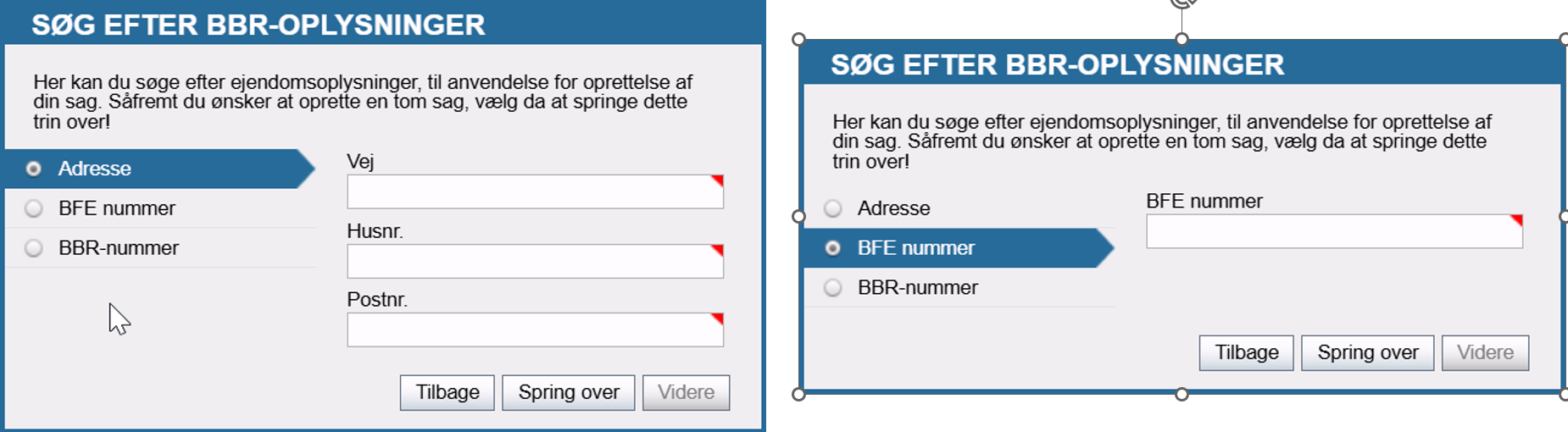 I det følgende udklip kan man vælge at anvende adresse eller BFE-data til oprettelse af sagen. For rapporttyperne Energimærke og BedreBolig anbefales det at oprette sagen ud fra BFE-oplysninger, så adresser fra starten kommer korrekt ind i sagen.