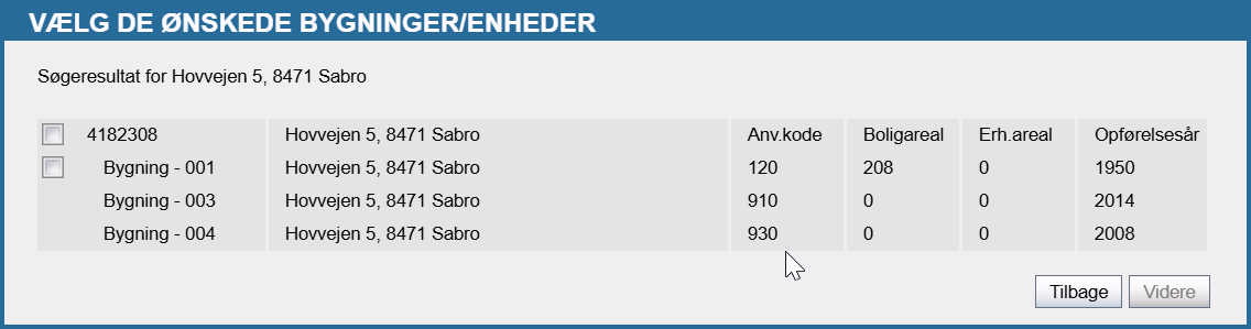 Efter udvælgelsen af bygning(er) og klik på Videre fremkommer et vindue, hvor man skal vælge bygningstype.