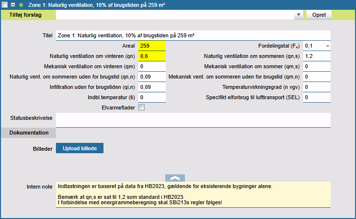 - Zone 1: 259 m2, mekanisk ventilation 90% af brugstiden.