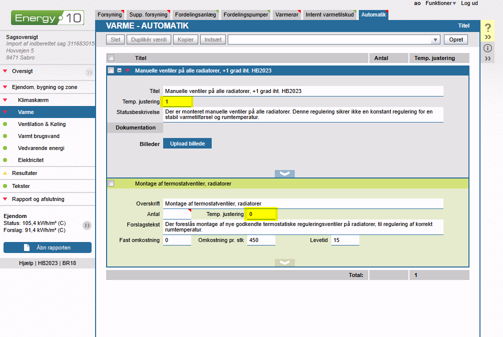 Ved at stille forslag om installation af termostatventiler og dermed gå fra +1 grad til 0 grader, angiver du, at hele varmeberegningen på forslagsbygningen skal gennemføres med 20 grader i stedet for de oprindelige 21 grader.