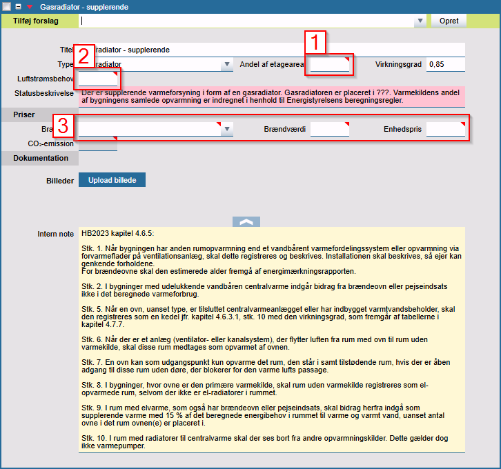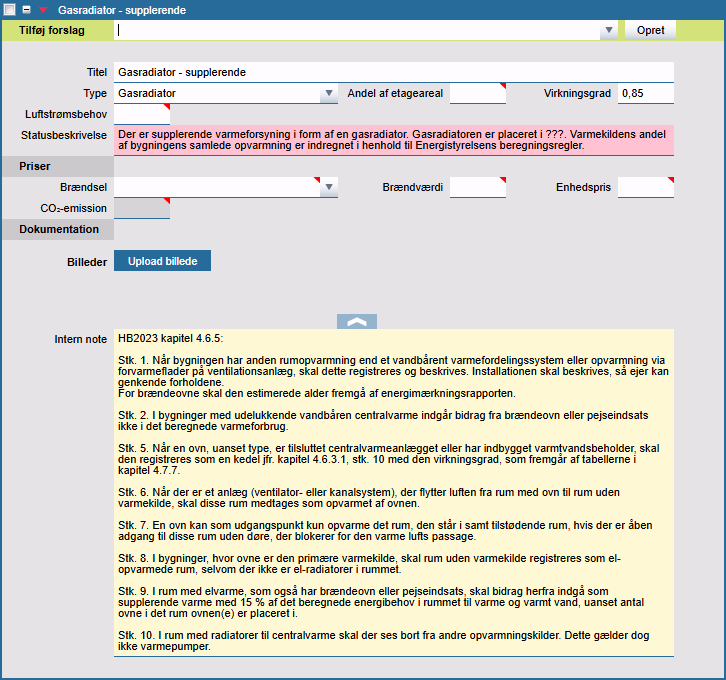 Der er i dette tilfælde taget udgangspunkt i en gasradiator, men der er reelt set ingen forskel på de felter der skal udfyldes, om man havde valgt en brændovn, pejs eller noget helt tredje.