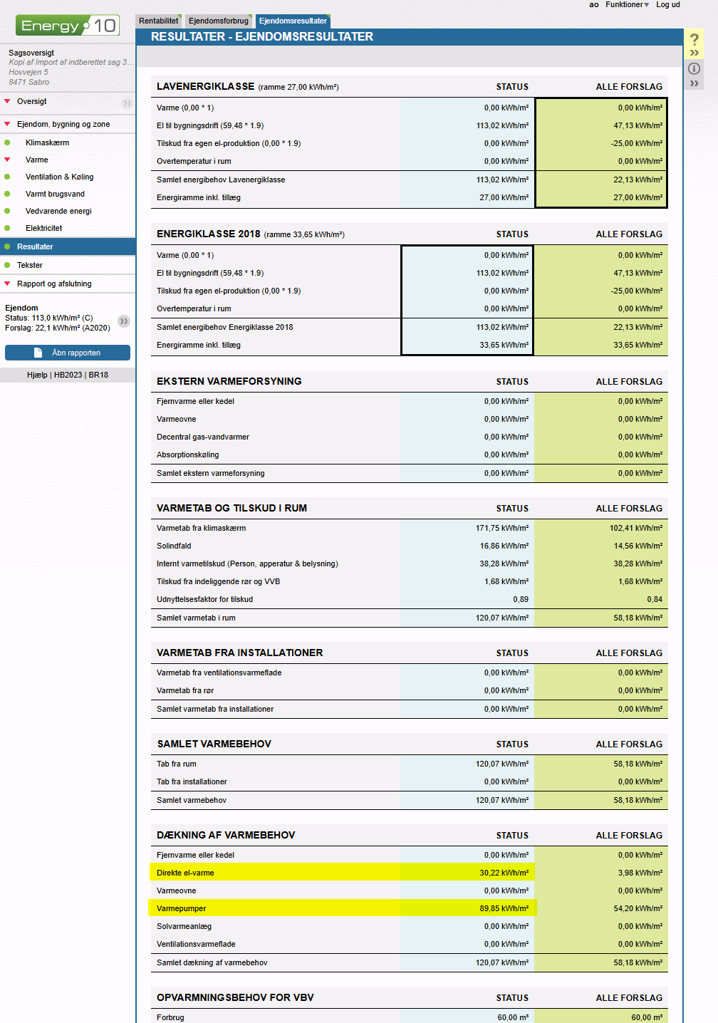 Under Resultater og fanen Ejendomsresultater kan vi se, at varmepumpen dækker 89,85 kWh/m², men der er også et forbrug af direkte el på 30,22 kWh/m².