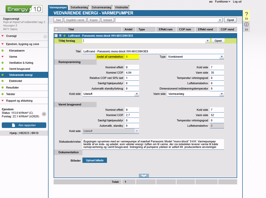 Under Vedvarende energi og fanen Varmepumper indtaster du de specifikke data for den ønskede varmepumpe.