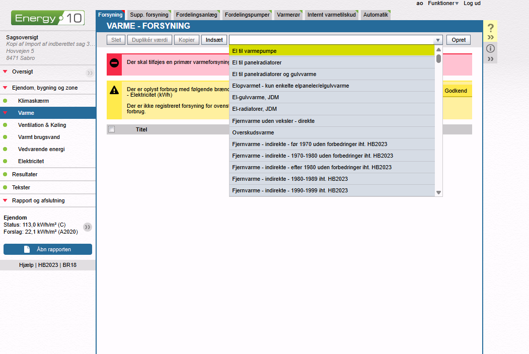 Hvis bygningen kun har en varmepumpe, skal du angive "El til varmepumpe" under Forsyning.