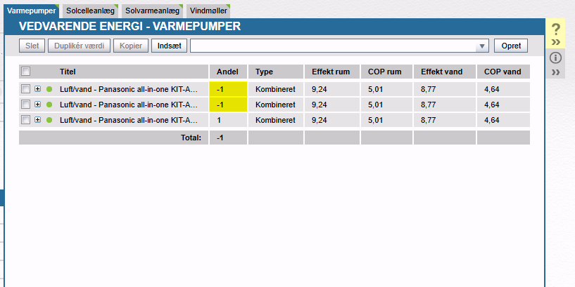 - Når en bygning opvarmes med flere varmepumper, skal du sætte et minus foran "Andel af varmebehov" på de første af flere varmepumper.