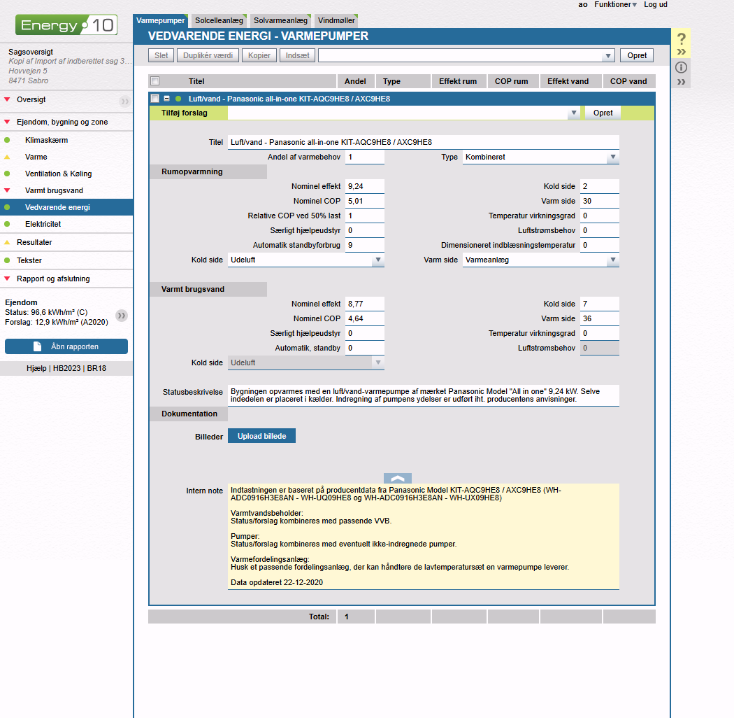 I Energy10 bliver varmepumpen indregnet først, og kedlen supplerer ved behov. Derfor er varmepumpens andel sat til "1".