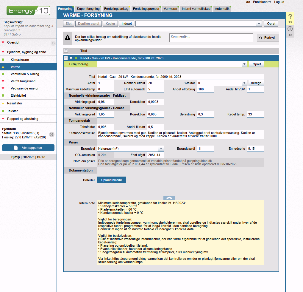 I Energy10 oprettes kedlen under Varme og fanen Forsyning.